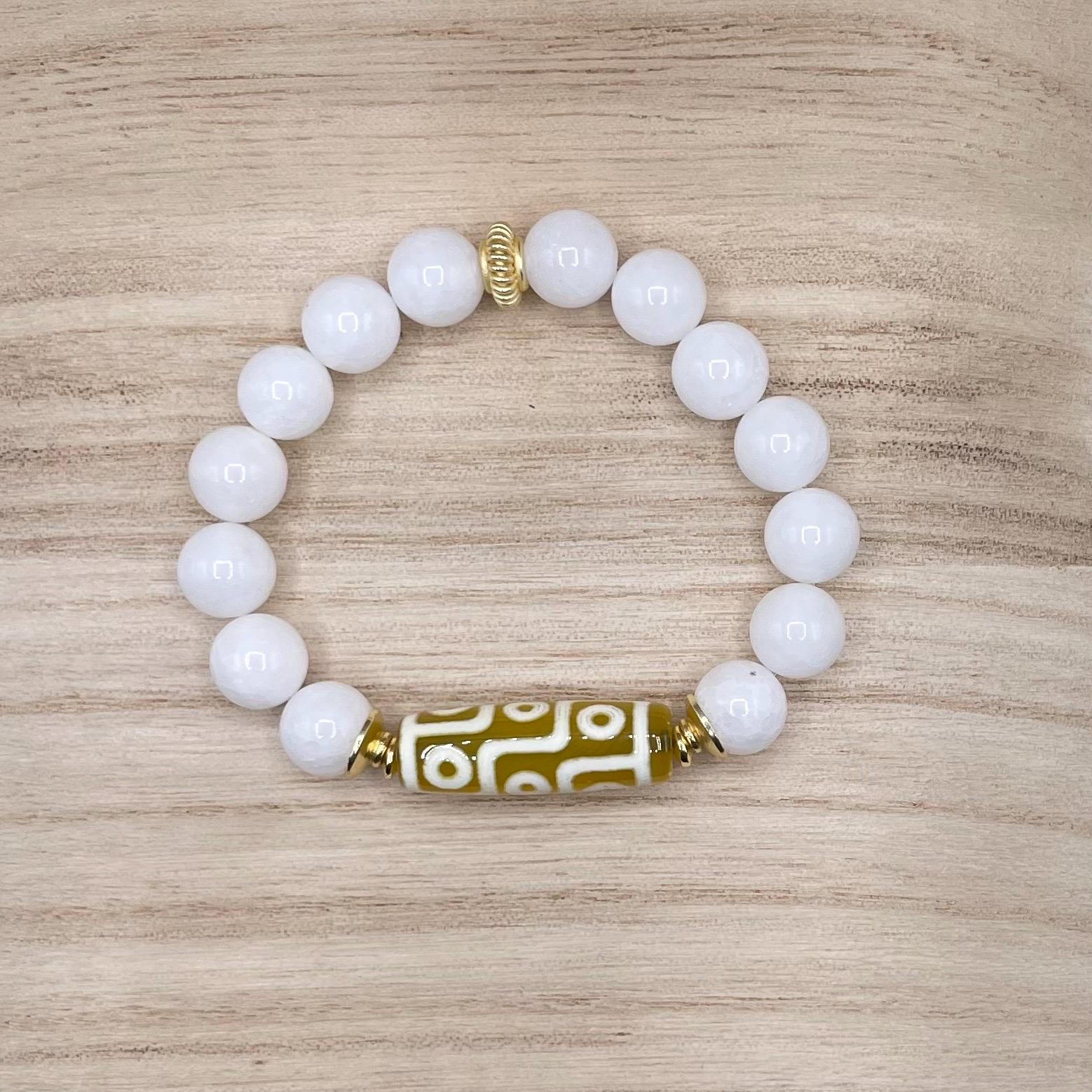 πΏ Bracelet 1: A yellow and white Tibetan agate focal bead paired with white banded agate gemstones, creating a soft but bold contrast.