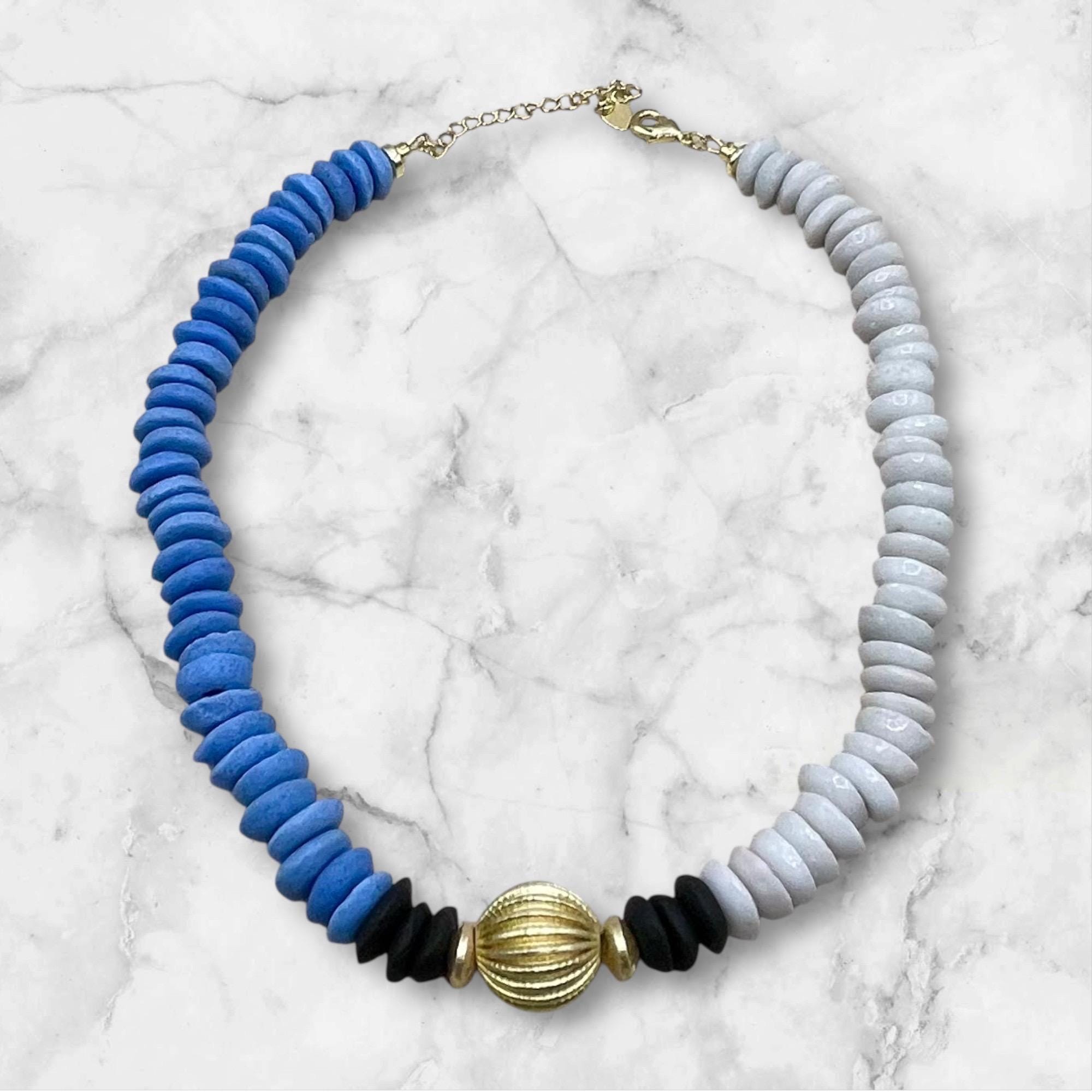 Show off your team pride in style with this handcrafted Carolina Blue & Black Game Day Necklace! Featuring chunky irregular rondelle glass beads in vibrant Carolina blue paired with striking black-and-white African fused glass accent beads, this necklace is the perfect statement piece for cheering on your favorite team.