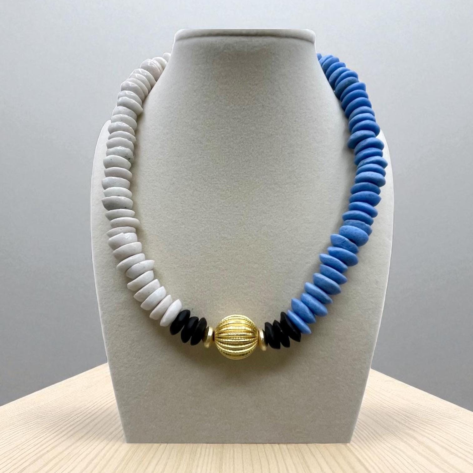 • Carolina blue glass African Ashanti irregular rondelle beads with black-and-white patterned fused African glass bead accents.